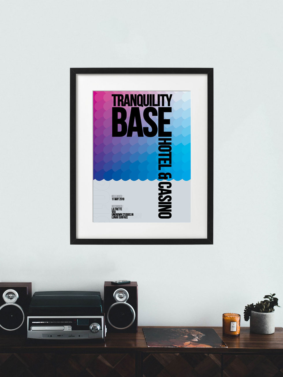 Arctic Monkeys Tranquility Base Art Poster inspired by the awesome 2018 album from the Sheffield Indie Rock band fronted by Alex Turner. This album features some epic tunes including Four Out of Five. The artwork features album info including the release date &, where it was recorded,