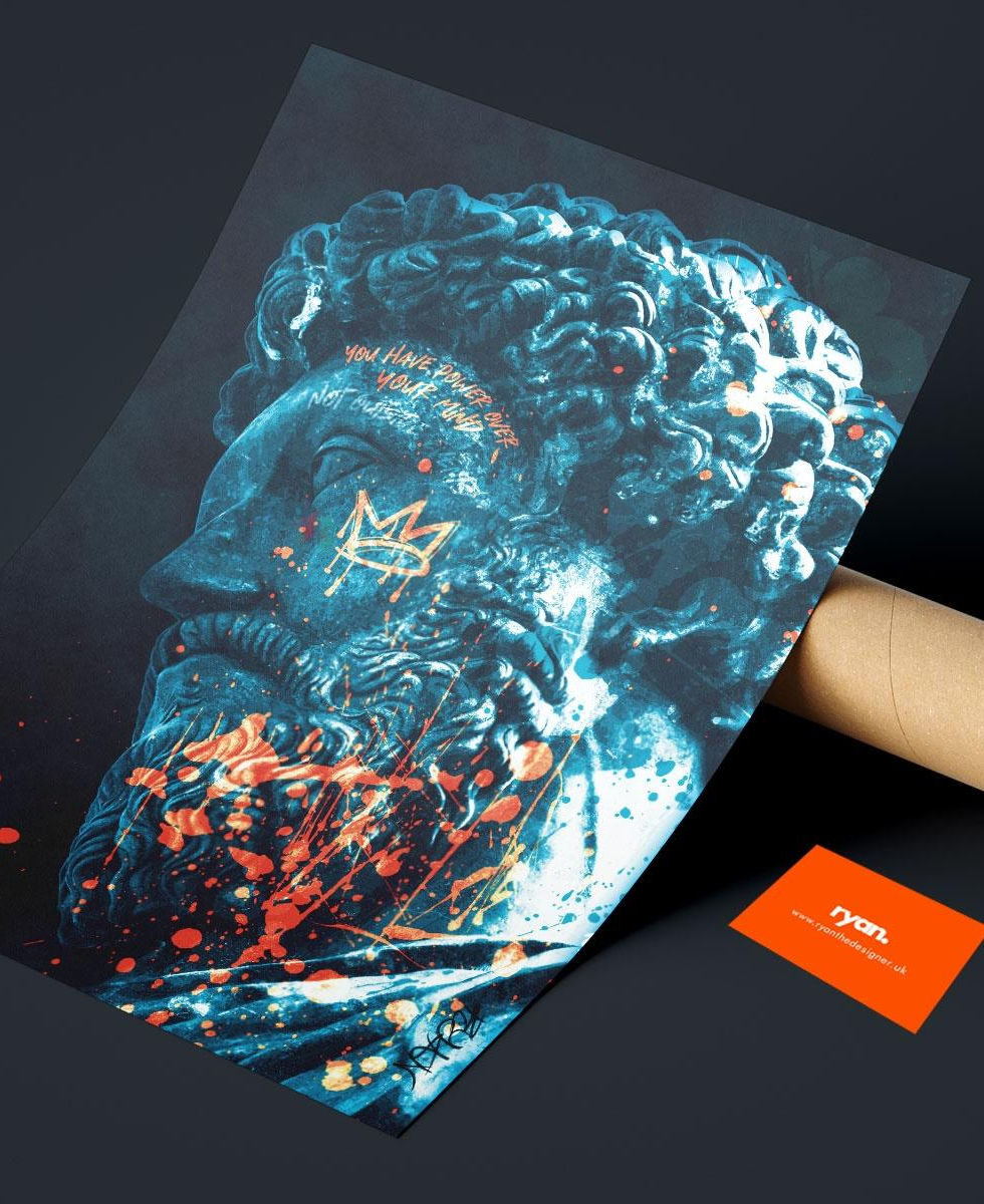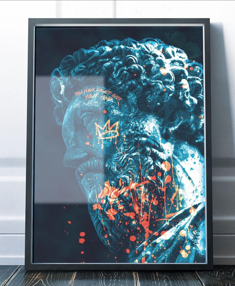 Elevate your urban workspace with this edgy yet inspiring art print featuring Marcus Aurelius. Infused with graffiti-style aesthetics, this matte archival print adds a bold statement to any decor. Channel the wisdom of the Roman emperor and elevate your surroundings with this unique blend of historical inspiration and contemporary urban art. Perfect for those seeking motivation and a touch of rebellious spirit in their workspace decor.